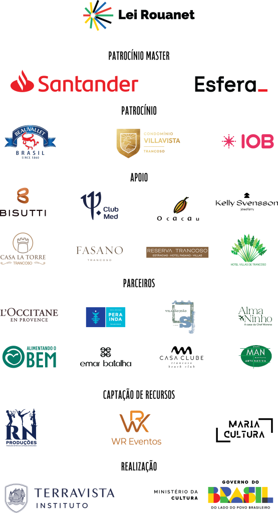 O Festival Música em Trancoso 2026 conta com o apoio do Ministério da Cultura e está aprovado na Lei Federal de Apoio à Cultura, a Lei Rouanet. Esta legislação permite que empresas tributadas pelo lucro real direcionem até 4% do imposto de renda ao projeto, enquanto pessoas físicas podem direcionar até 6% do imposto de renda. Essa é uma oportunidade única de investir em cultura com benefícios fiscais, fortalecendo a imagem de sua marca como promotora de iniciativas culturais.
